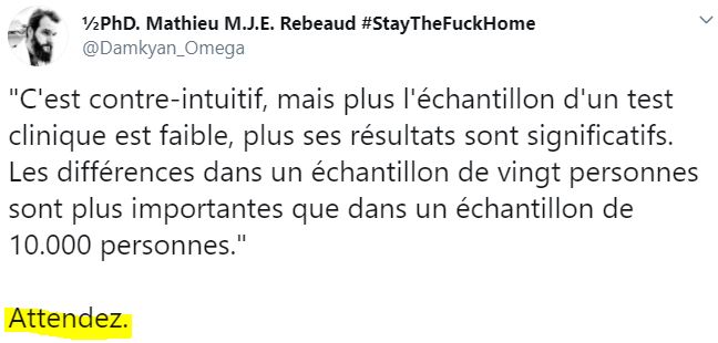 [Marianne] Concernant les bémols émis quant à la méthodologie de ses récents essais cliniques : « C'est contre-intuitif, mais plus l'échantillon d'un test clinique est faible, plus ses résultats sont significatifs. Les différences dans un échantillon de vingt personnes peuvent être plus significatives que dans un échantillon de 10.000 personnes.Si on a besoin d'un tel échantillonnage, il y a des risques qu'on se trompe. Avec 10.000 personnes, quand les différences sont faibles, parfois, elles n'existent pas.«