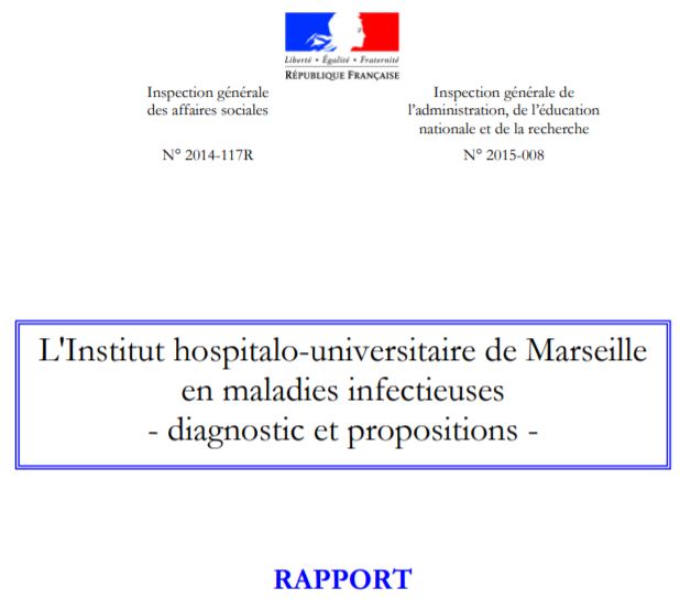 « Ce rapport conjoint IGAS-IGAENR porte sur l'Institut hospitalo-universitaire (IHU) en maladies infectieuses établi à Marseille.... Il analyse sa situation financière qui n'apparaît plus de nature à mettre en péril le projet. Il constate que la structuration du projet tant médical que de recherche de l'IHU n'est pas achevée sur des points importants et pèse sur l'ambition du projet. Enfin, il montre que la gouvernance et le management du projet sont inadaptés à ses enjeux actuels et que des changements rapides et profonds devraient être requis par les financeurs et les fondateurs. » [Rapport IGAS]