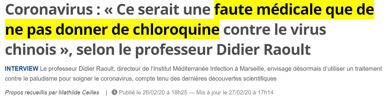 N'en restant pas là, il est allé ensuite dans les médias porter son message, comme ici dans 20 Minutes (nous enlevons la plupart des parties concernant la chloroquine, ce n'est pas notre axe d'analyse ici, mais plus d'analyser son expression verbale et son éthique médicale) :