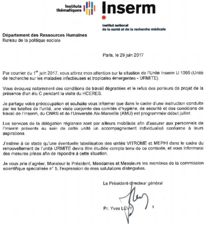 En réaction, les syndicats s'organisent et informent les tutelles, dont l'INSERM le 1er juin 2017. Le Directeur de l'Inserm Yves Levy leur répond le 29 juin, en leur indiquant qu'il a demandé une inspection de l'Urmite par les CHSCT ( source) :