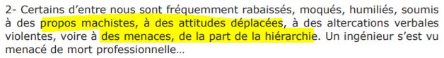 « Il n'en reste pas moins que, à notre connaissance, ce sont au moins 6 femmes qui ont eu à subir, au sein de l'URMITE, des faits de ce que nous pensons être, au minimum, du harcèlement sexuel, et que cela nous amène à faire plusieurs commentaires....La tenue de propos graveleux semble être une pratique courante. Comme exemple qui nous a été rapporté, à une ITA qui portait une coudière, un chercheur aurait demandé si c'était « à force de branler ? ». On peut également citer, une phrase qui aurait été coutumière d'un autre chercheur « Il est 4 heures, c'est l'heure de ma pipe, qui est-ce qui s'y colle ? »....