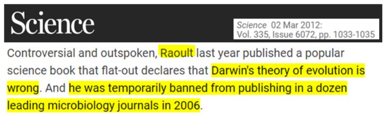« Controversé et franc, Raoult a publié l'année dernière un livre scientifique populaire qui déclare catégoriquement que la théorie de l'évolution de Darwin est fausse. Et il a été temporairement interdit de publication dans une douzaine de grandes revues de microbiologie en 2006. » [Science, 02/03/2012]