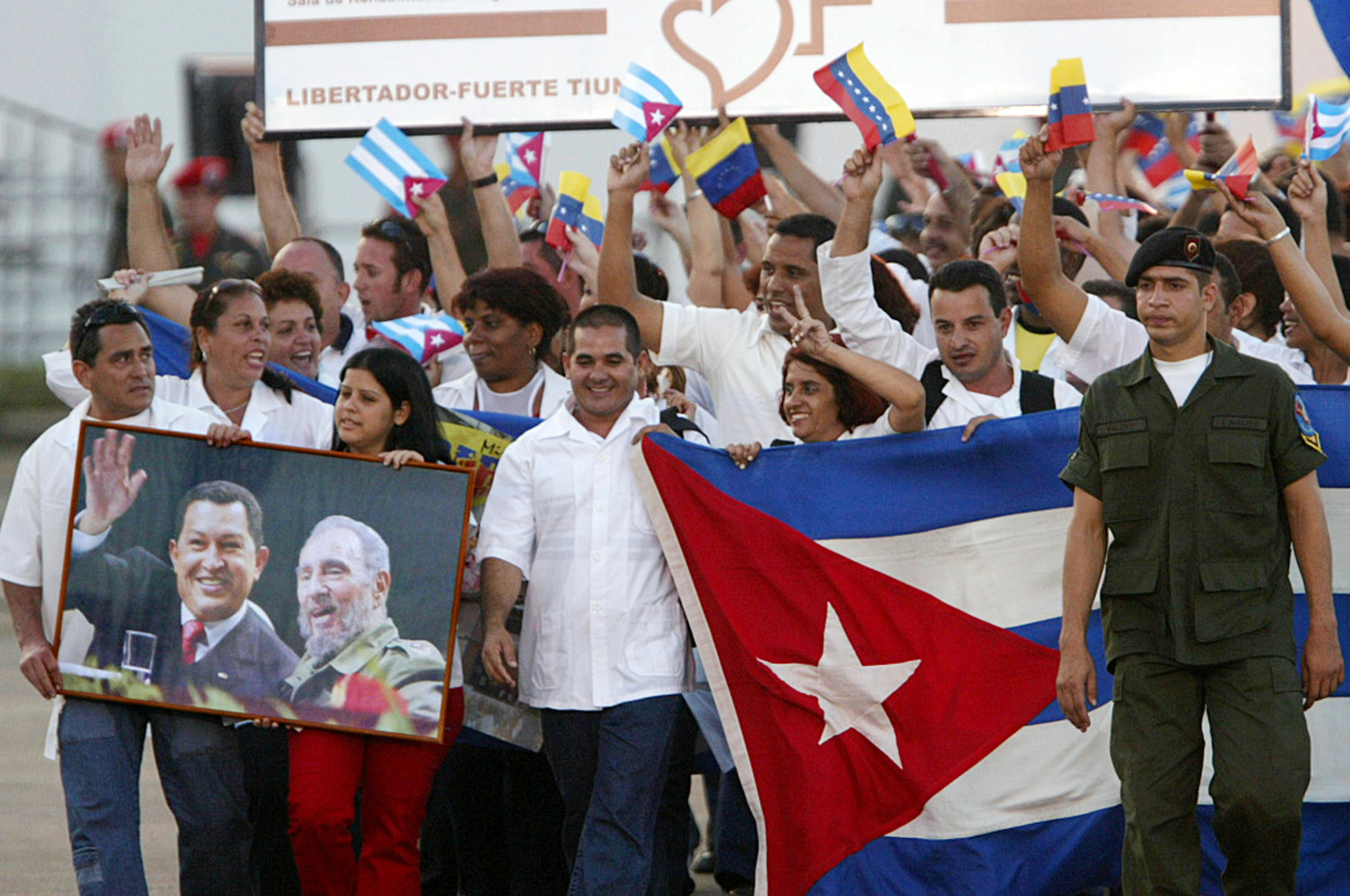 © Andrew Alvarez Source: AFPLes médecins cubains de la mission "Barrio adentro" participent à un défilé militaire en présence présence du président vénézuélien Hugo Chavez, à Caracas, le 2 février 2006.