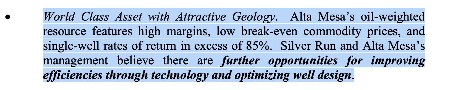 Un actif de classe mondiale avec une géologie attrayante. Les ressources pétrolières pondérées d'Alta mesa se caractérisent par des marges élevées, un faible seuil de rentabilité des prix des matières premières et un taux de rendement de plus de 85 % pour un seul puits. La direction de Silver Run et d'Alta Mesa estime qu'il existe d'autres possibilités d'améliorer l'efficacité grâce à la technologie et d'optimiser la conception des puits.