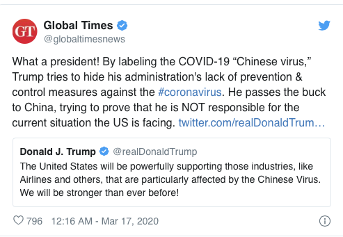 Tweet Global Times:Quel président ! En qualifiant la COVID-19 de « virus chinois », Trump tente de masquer le manque de mesures de prévention et de contrôle de son administration contre le #coronavirus. Il passe le flambeau à la Chine, en essayant de prouver qu'il n'est PAS responsable de la situation actuelle à laquelle les Etats-Unis font face. twitter.com/realDonaldTrump