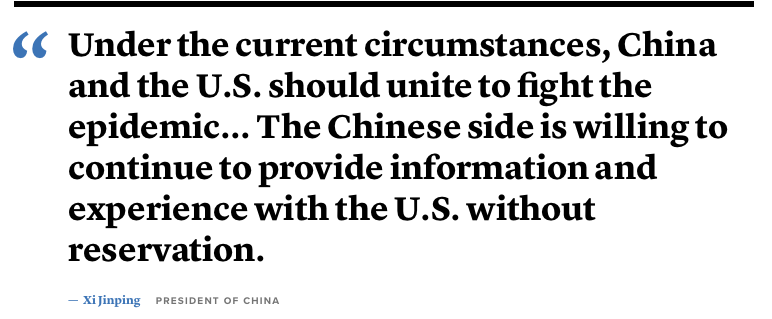 « Dans les circonstances actuelles, la Chine et les États-Unis devraient s'unir pour combattre l'épidémie La Chine est prête à continuer à fournir sans réserve des informations et leurs expériences aux États-Unis.