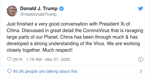 Je viens de terminer une très bonne conversation avec le président chinois Xi. Il a discuté en détail du CoronaVirus qui ravage une grande partie de notre planète. La Chine a traversé tant de choses et a développé une solide compréhension du virus. Nous travaillons en étroite collaboration. Avec beaucoup de respect !