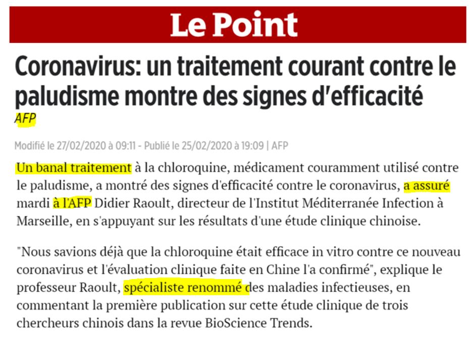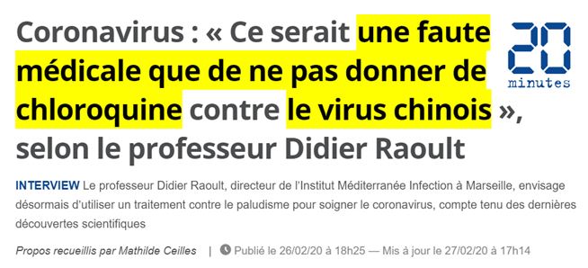 Les médias n'ayant à l'évidence pas la compétence pour traiter « en direct » de sujets aussi complexes, ils laissent passer des informations dangereuses pour la santé publique. Nous pensons par exemple à ce passage de l'interview de Didier Raoult (né en 1952 à Dakar), du 26 février dans 20 Minutes ( source) :