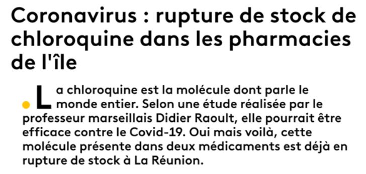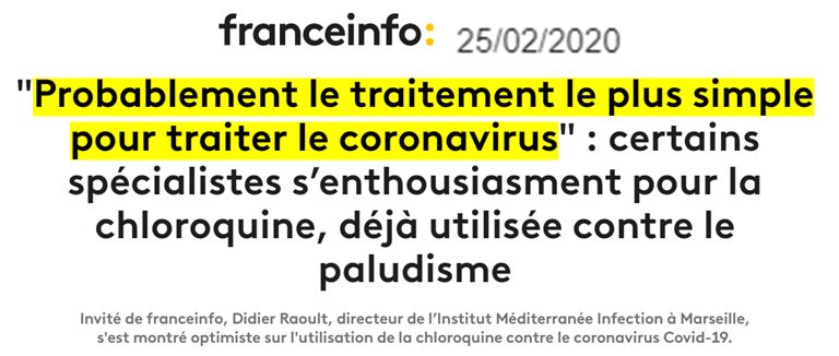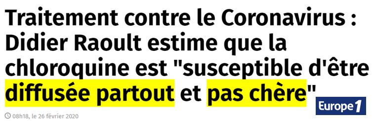 La seule chose que je vous dis : faites attention, il n'y aura bientôt plus de chloroquine dans les pharmacies. » [Didier Raoult, Youtube , 25 février 2020]