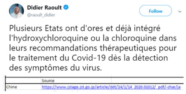« Pour l'instant, comme il n'y a pas d'autres alternatives qui soient crédibles, entre donner un médicament qui a été testé par les gens qui ont le plus de connaissances au monde sur une maladie et essayer une nouvelle molécule, en disant, écoutez, peut-être que cette nouvelle molécule marche, il faut revenir à une réflexion basique, si vous voulez, qui n'est pas une réunion d'opinion, mais une réunion, de factuellement, qu'est-ce que vous avez qui vous permet de dire que le gouvernement chinois et tous les scientifiques chinois qui font une information prioritaire se trompent. » [Didier Raoult, Youtube , 28 février 2020]