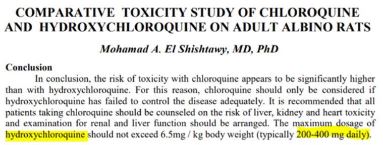Au niveau de l'hydroxychloroquine, moins toxique que la chloroquine, Shishtawy et al. en 2014 recommandaient de ne pas dépasser « 6,5 mg/kg de poids corporel », et recommandent une dose typique de 200-400 mg/j. ( la source est ici)