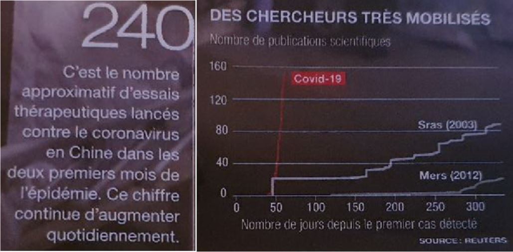 Environ 240 essais ont été lancés en Chine les 2 premiers mois, et les publications scientifiques pleuvent, sans commune mesure avec ce qui a été fait pour les virus SRAS-1 en 2003 ou MERS en 2012. (Source : Science et Vie, avril 2020)
