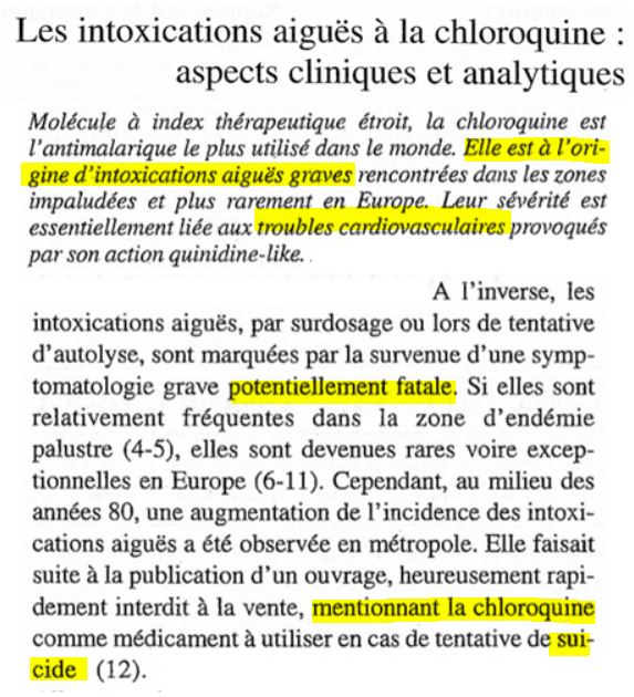 Ne vous « jetez donc pas dessus », et ne surdosez pas la chloroquine (bien plus toxique que l'hydroxy-chloroquine), surtout au long cours. Pour mémoire, en voici les 3 plus graves effets secondaires ( source) :