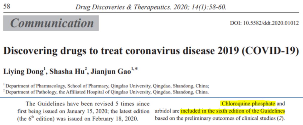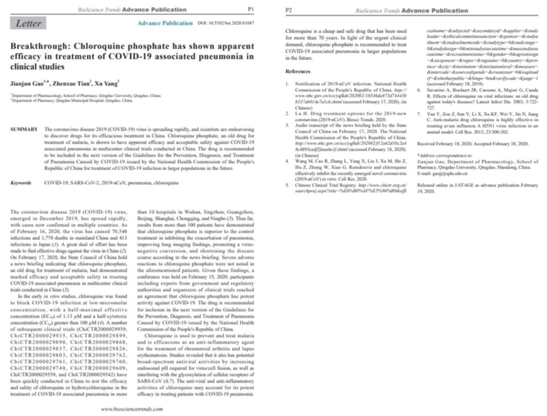 « Les résultats sur plus de 100 patients ont démontré que le phosphate de chloroquine est supérieur au traitement de contrôle pour inhiber l'aggravation de la pneumonie, améliorer les résultats d'imagerie pulmonaire, favoriser une conversion négative de la charge virale, et raccourcir le cours de la maladie. Des réactions indésirables graves au phosphate de chloroquine n'ont pas été notées chez les patients mentionnés ci-dessus. Compte tenu de ces constatations, une conférence s'est tenue le 15 février 2020 ; les participants, y compris des experts du gouvernement et des autorités réglementaires ainsi que des organisateurs d'essais cliniques, se sont accordés pour dire que le phosphate de chloroquine montre une efficacité puissante contre le COVID-19.... La chloroquine est un médicament bon marché et sûr. » [BioScience, 18 février 2020]