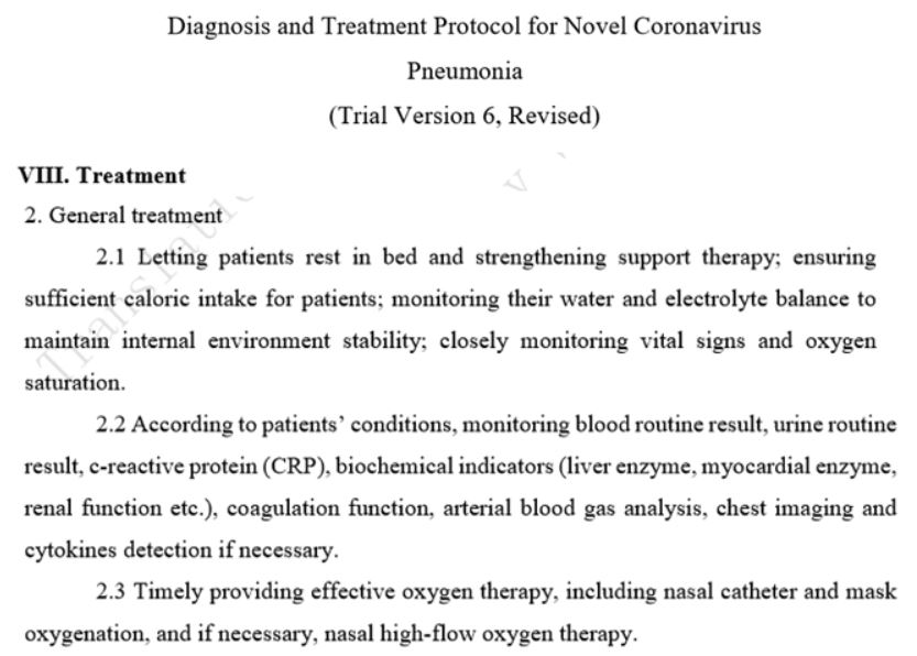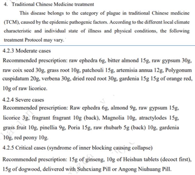Et pour le reste, voici ce qu'indiquent désormais les recommandations chinoises actuelles pour le traitement du coronavirus, qui viennent d'être révisées pour introduire la chloroquine et dont nous vous proposons la traduction Who-translation.pdf. (source : V6 cn, pdf, V6 en ou ici, arch) :