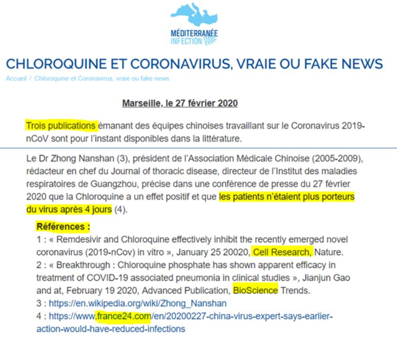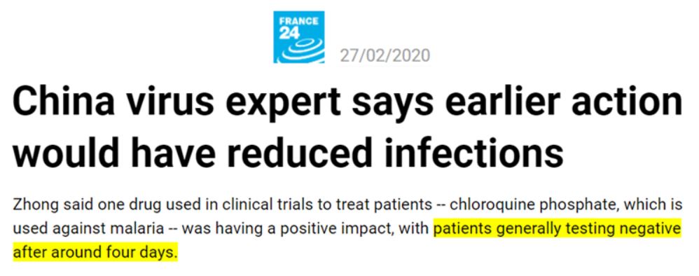 « Zhong a déclaré que... la chloroquine a un impact positif, avec des patients généralement testés négatifs après environ quatre jours. » [France24, 27 février 2020]