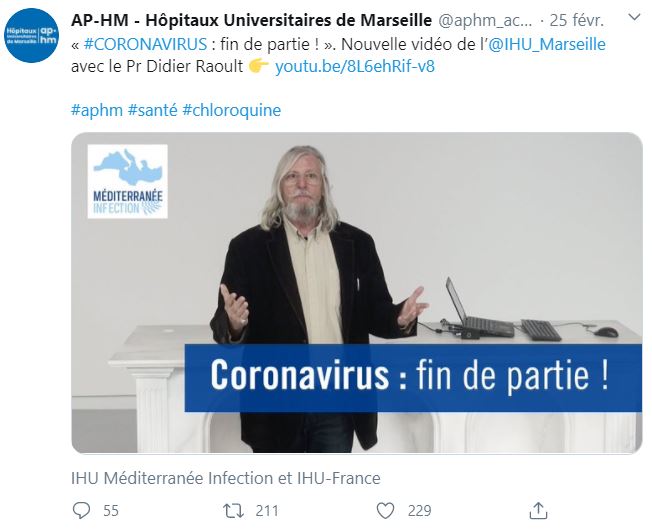 Didier Raoult, lui, a couru voir ses étudiants, pris sa caméra, et posté cette vidéo sur Youtube le 25 février (1 semaine après la lettre) : « Fin de Partie pour le coronavirus ! » (re-sic.), pour faire de la publicité à la chloroquine :