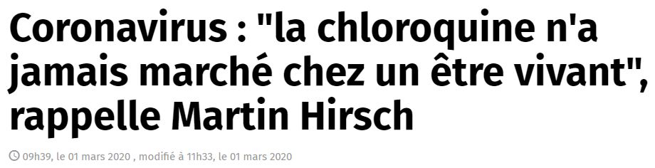 « Tous les spécialistes que j'ai vus disent que la chloroquine : 'à chaque fois qu'il y a un nouveau virus, il y a un type qui dit que ça va marcher.... La chloroquine marche très bien dans une éprouvette, mais n'a jamais marché [à ce jour] chez un être vivant. » [Martin Hirsh, Europe 1, 1er mars 2020]