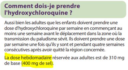 En préventif du paludisme, c'est 400 mg par semaine. Raoult propose 600 mg par jour, soit près de 11 fois la dose...