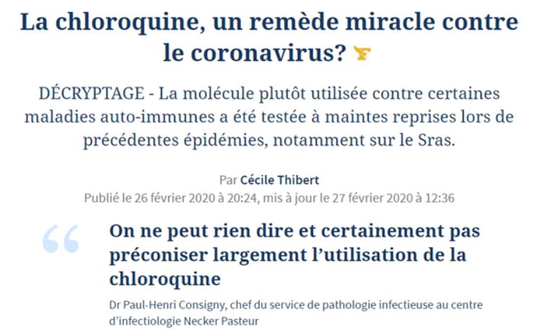 « Par ailleurs, un patient de 54 ans atteint du Covid-19 a été testé négatif après avoir reçu un traitement de phosphate de chloroquine a révélé, le 17 février, Sun Yanrong, la vice-directrice du centre de biologie du Ministère des Sciences et technologies. » [ Le Monde, 24 mars 2020]
