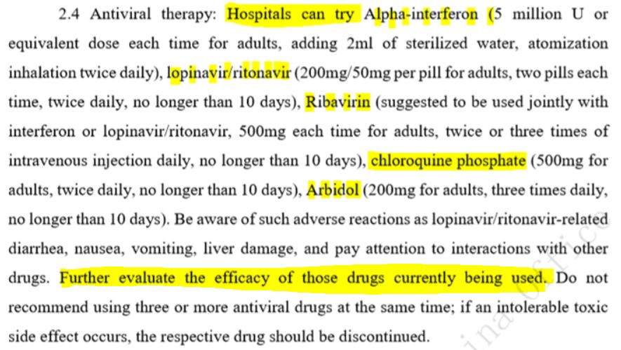 - ce n'est nullement LE traitement des Chinois comme il le laisse complaisamment entendre, mais simplement 1 des 5 traitements possibles, qui a été ajouté tardivement (avec l'Arbidol) et sans supplanter les autres ;