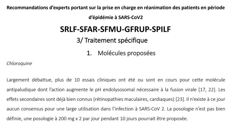 Voici d'ailleurs un extrait du document des recommandations d'experts suivies par les centres de référence Covid-19 de la région parisienne, qui émane des sociétés médicales :