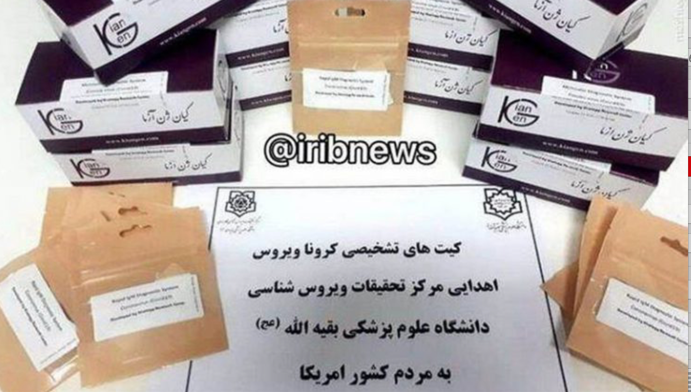 « Des kits de dépistage du coronavirus, offert aux Américains par la Faculté de médecine des forces armées iranienne ». ©Aftab News