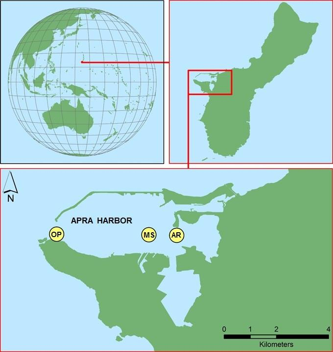 OP = Orote Point ; MS = Middle Shoals ; AR = Anchor Reef. Apra Harbor est le seul port naturel de Guam