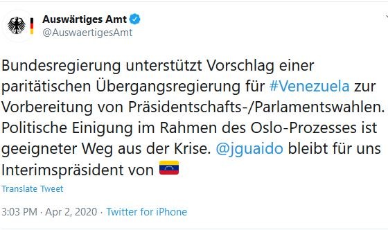 "Le gouvernement allemand soutient la proposition de créer un gouvernement de transition équitable pour le Venezuela, pour préparer les élections présidentielles et parlementaires. Un accord politique, dans le contexte du procès de Oslo, est la bonne route à prendre pour pouvoir sortir de la crise. @jguaido reste pour nous le président provisoire et de transition du Venezuela".