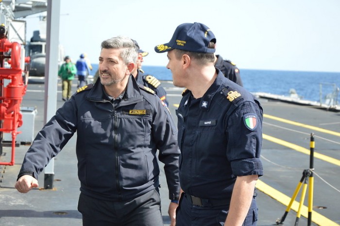 Le commandant espagnol Francisco Javier Vázquez Sanz accueilli par l'amiral italien Alberto Maffeis à bord du navire San Giusto