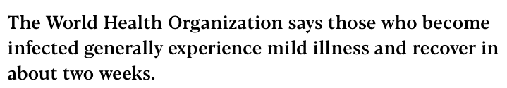« Les symptômes les plus fréquemment signalés [de la COVID-19] comprennent la fièvre, la toux sèche et l'essoufflement, et la plupart des patients (80 %) ont souffert d'une maladie légère. Environ 14 % ont souffert d'une maladie grave et 5 % ont été gravement malades. Les premiers rapports suggèrent que la gravité de la maladie est associée à l'âge (>60 ans) et à une maladie co-morbide ». (en se basant largement sur l'évaluation de l'OMS de la COVID-19 en Chine)