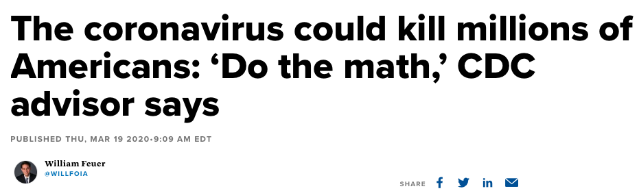 William Feuer @WILLFOIA: Le coronavirus pourrait tuer des millions d'Américains : « Faites le calcul », dit le conseiller du CDCPublié THU, Mar 19 2020 + 9:09 AM EDT