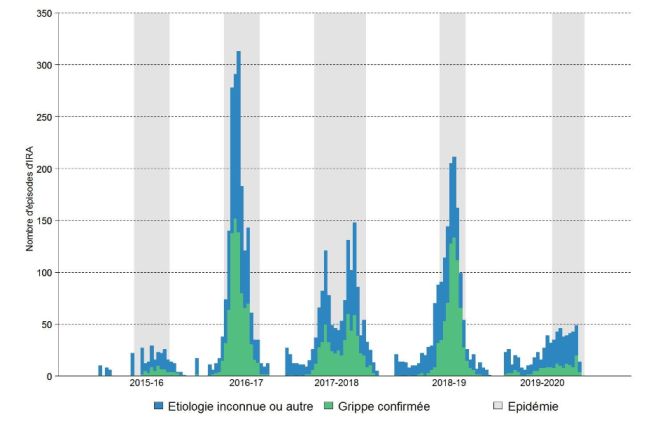 Évolution hebdomadaire du nombre d'épisodes de cas groupés d'IRA en collectivités de personnes âgées par semaine de début de l'épisode en France métropolitaine, de la semaine 40/2015 à la semaine 11/2020*Concernant les personnes âgées qui paient le plus lourd tribut en matière d'infection respiratoire aiguë (IRA), le graphique français ci-dessous est plus qu'intéressant car il illustre l'évolution de celle-ci de 2015 au 18 mars 2020. On y voit un pic d'épisodes pour la saison 2016-2017, plus impressionnant que celui de 2018 en matière d'épisodes de cas groupés de IRA. Nous relevons aussi et surtout les marquages en bleu qui indique « une étiologie inconnue ou autre »! Voilà donc des causes de mortalité qui ne sont pas identifiées alors même que nous sommes en présence de IRA Un lien avec des coronavirus non identifiés, le COVID-19? Bulletin_grippe France #cc99ffolor