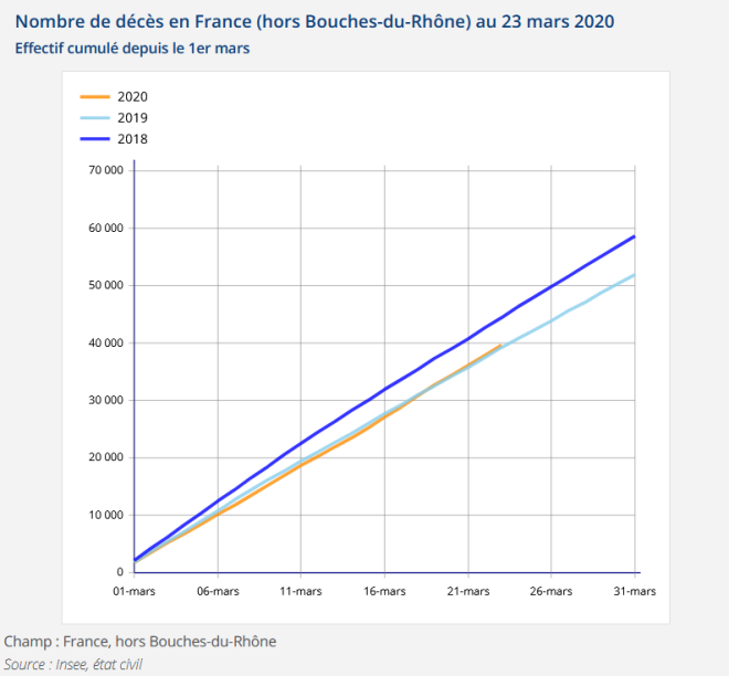 Grâce à des lecteurs attentifs, nous pouvons présenter les courbes de décès en France (hors les Bouches du Rhône) de l'INSEE entre le 1 er et le 23 mars 2020:
