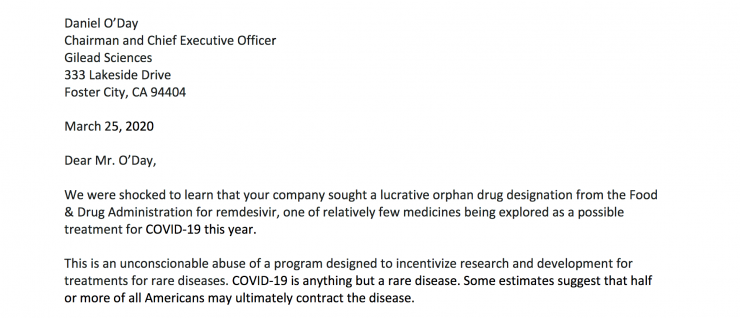 « Vous vous rendez compte, une compagnie a demandé un statut de 'médicament pour une maladie rare' alors qu'il s'agit d'une pandémie ! », s'indigne, presque incrédule, Patrick Durisch, de Public Eye. L'attribution de ce statut a très vite suscité des protestations. Une coalition d'organisations a adressé, le 25 mars, une lettre au PDG de Gilead, Daniel O'Day : « Nous sommes choqués d'apprendre que votre entreprise a demandé à la Food and Drug Administration le statut de "médicament orphelin" pour le remdésivir, l'un des rares traitements actuellement à l'étude pour le Covid-19. C'est un usage totalement abusif d'un programme pensé pour inciter la recherche et le développement de traitements de maladie rares. Le Covid-19 est tout sauf une maladie rare. Certaines estimations suggèrent que la moitié de la population des États-Unis ou même plus pourrait contracter la maladie », écrivent-elles [3].