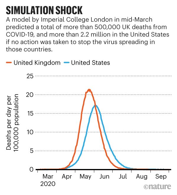 Lorsque les données actualisées du modèle 1 de l'équipe impériale ont indiqué que le service de santé du Royaume-Uni serait bientôt submergé par le COVID-19, et pourrait faire face à plus de 500 000 décès si le gouvernement ne prenait aucune mesure, le Premier ministre Boris Johnson a presque immédiatement annoncé de nouvelles restrictions strictes sur les déplacements des personnes. Le même modèle a suggéré que, sans action, les États-Unis pourraient faire face à 2,2 millions de décès ; il a été partagé avec la Maison Blanche et de nouvelles orientations sur la distanciation sociale ont rapidement suivi (voir « Simulation de choc »).