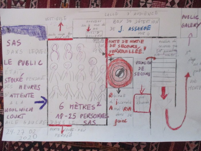 La tension est telle que je ne remarque que deux jours plus tard que le « boyau » ou nous allons passer beaucoup de temps d'attente est en fait un sas, que les 25 personnes stockées dedans empêchent donc le dégagement des CHC (Circulation Horizontale Commune 4) et leur présence bloque le RIA (Robinet d'Incendie Armé) enfermé dans une gaine -cette situation viole les normes de sécurité incendie communément admises, en Grande-Bretagne comme en France. Pire, je remarque bientôt que la porte verrouillée devant laquelle nous attendons est une... sortie de secours ! Une sortie de secours donnant sur un escalier de de secours ne doit jamais être verrouillée car en cas d'incendie nous ne pourrons pas évacuer et nous pouvons tout simplement mourir. Justement, peu avant 10 heures, l'agent de sécurité déverrouille la sortie de secours et nous fait entrer dans un escalier qui est visiblement un escalier de secours. Nous devons monter par là pour arriver sur un palier ou nous passons une porte coupe-feu, nous nous trouvons dans une antichambre ou se trouve des toilettes femmes à droite et homme à gauche, et d'où deux couloirs mènent à droite à la « court 3 » et à gauche à la « court 2 ». La notre est la salle 2, il faut encore entrer dans un autre espace ou se trouvent deux portes qui probablement sont les accès vers la galerie en temps normal. Un autre agent de sécurité, grand rouquin sévère, ouvre une troisième porte et nous indique les sièges à occuper. Derrière une baie vitrée, surplombant la salle d'audience de 10 mètres au moins, se trouve la galerie du public avec 18 sièges disposés en deux rangées. Au fond se trouve encore une porte verrouillée.