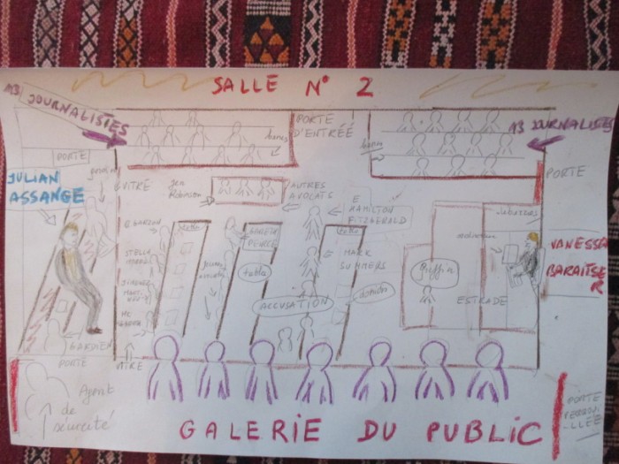 Edward Hamilton brosse alors de quelques phrases flatteuses la « saga Wikileaks » qui a duré quelques mois, un an maximum en 2010 et 2011. Dans sa bouche Julian Assange se mélange à « Wikileaks » sans qu'on sache trop qui décide de quoi. Il crédite même le site de « catalyseur des révolutions arabes en exposant la corruption du clan Ben Ali en Tunisie» ce qui me fait sourire un peu jaune. Par les amis de l'UGET, de Redeyef, du Parti Patriote Démocrate que j'ai soutenus dès 2011, je sais bien que les Tunisiens n'avaient pas besoin d'Occidentaux pour se rendre compte de la violence et de la corruption de la dictature dans laquelle ils vivaient. Je sais aussi que la vraie Révolution de décembre 2010 est bien partie de manifestations lancées par les militants de l'UGET, l'une des plus vieilles organisations syndicales de l'Afrique, de même que le mouvement de la « Kasbah 1 » en février 2011 a été initié par deux jeunes filles désespérées par la répression, Zahra et Hawra Khammassi, Zahra étant responsable du syndicat UGET à la Faculté du 9 avril. J'espère un jour pouvoir faire rencontrer à Julian Assange les vrais protagonistes de cette histoire, mais pour cela il faut le sortir de cette taule. Pendant que l'avocat continue d'exposer le déroulé de l'affaire, je vois enfin que Julian Assange me regarde fermement, je répond immédiatement en soutenant son regard. Puis il parait plus fatigué et les gestes auto-centrés et répétitifs réapparaissent : il se frotte les doigts et de nouveau lève la tête vers le plafond comme quand on a mal au dos. Mais je vois alors encore mieux son regard qui dit sa souffrance.