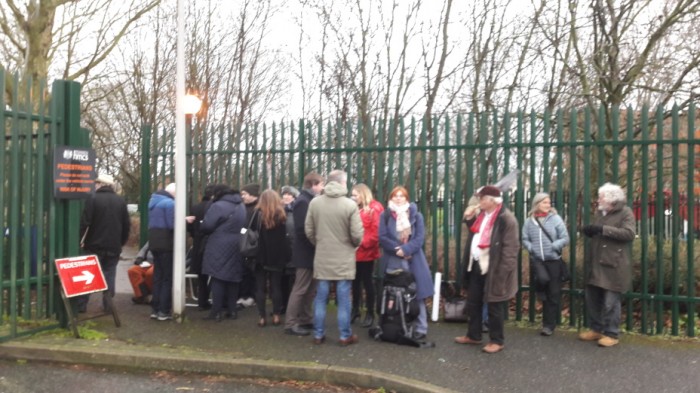 Mais d'abord il a fallu entrer dans les locaux. Je n'ai pu prendre le métro et le bus de banlieue de Londres qu'à 5h30 du matin et arriver sur place qu'à 6h45. D'emblée j'ai remarqué le camping de tentes dans le petit parc attenant à la grille de la prison et de la cour. Jamais une police n'aurait permis en France à des militants de camper devant les murs d'une prison. L'Angleterre n'en finit pas de m'étonner avec son système laxiste sur certains points, tolérant des passe droits, des discriminations, des violences et encourageant le viol des règles, des procédures et des droits dans d'autres circonstances. Justement la règle du « premier arrivé premier servi » pour laquelle nous avions tant lutté à la Westminster court est en passe d'être violée une nouvelle fois : Il y a 14 personnes devant la file d'attente devant la grille et Greekemmy a déjà crée une liste illégale sur laquelle elle inscrit les gens après leur avoir dument arraché leur nom sous la menace de ne pas pouvoir entrer malgré avoir attendu. Juste devant moi se tiennent Christophe Deloire, secrétaire général de Reporters sans Frontières, Christian Mihr, son homologue de la filiale en Allemagne et Rebecca Vincent, responsable du bureau de RSF en Grande Bretagne. Je proteste à haute voix contre l'apparition de la liste. Je sais d'expérience que de nouvelles personnes arrivées plus tard y seront inscrites et que du fait de cette resquille je ne pourrai pas entrer. Greekemmy fonce vers moi, élève le ton, me menace d'être expulsée du tribunal. Je prends Christophe Deloire à témoin, en Français. Il a l'air de soutenir la liste de Greekemmy alors que je lui dis qu'il ne tolérerait certainement pas ce genre de situation en France, qu'une personne lambda prenne le nom de gens dans l'espace public et décide de qui a le droit d'entrer dans un tribunal, alors pourquoi accepte - t-il cela dans le cadre du procès de Julian Assange. Il ne me répond pas, mais lorsque d'autres personnes arrivées plus tard passent devant nous, une Américaine vivant en France, qui se tient derrière nous décide elle aussi de ne plus se laisser faire. Nous restons ainsi une heure à discuter sur les aspects culturels de notre aventure alors qu'arrivent l'avocat Edward Hamilton Fitzgerald, Gareth Peirce, mais surtout de très nombreux journalistes et caméramans qui entrent directement dans le bâtiment après présentation d'une carte de presse aux agents de sécurité. Cependant, toutes les cartes de presse ne se valent pas car les membres de Wikijustice qui montrent la leur sont refoulés. Des policiers, probablement municipaux arrivent aussi et saluent Greekemmy et ses proches d'un air débonnaire. Ils demandent juste à un jeune homme derrière nous d'enlever son masque d'Anonymous et signalent qu'il n'y aura que 18 places pour le public.