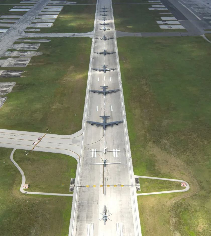 Bombardiers stratégiques lourds B-52H sur l'île de Guam... qu'ils viennent de déserter subitement après 16 ans de présence ininterrompue...