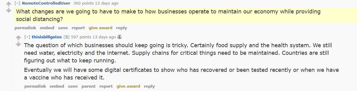 Le 18 mars, Bill Gates a participé à un AMA (Ask Me Anything, demandez-moi ce que vous voulez) sur Reddit, sous le titre je suis Bill Gates, vice-président de la fondation Bill & Melinda Gates. Demandez-moi ce que vous voulez sur le COVID-19, au cours duquel il a répondu à des questions quant à la pandémie. Dans l'une de ses réponses, Gates a mentionné un « certificat numérique » pour garder la trace de qui s'est fait vacciner.