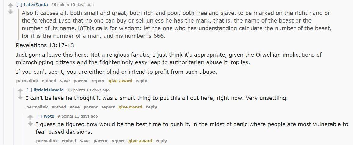 Si la plupart des réponses de Gates ont été reçues avec des éloges, celle-ci a soulevé beaucoup de doutes. La réponse la plus plébiscitée souligne les similitudes entre la solution de Gates et la « marque de la bête » dans la Bible.