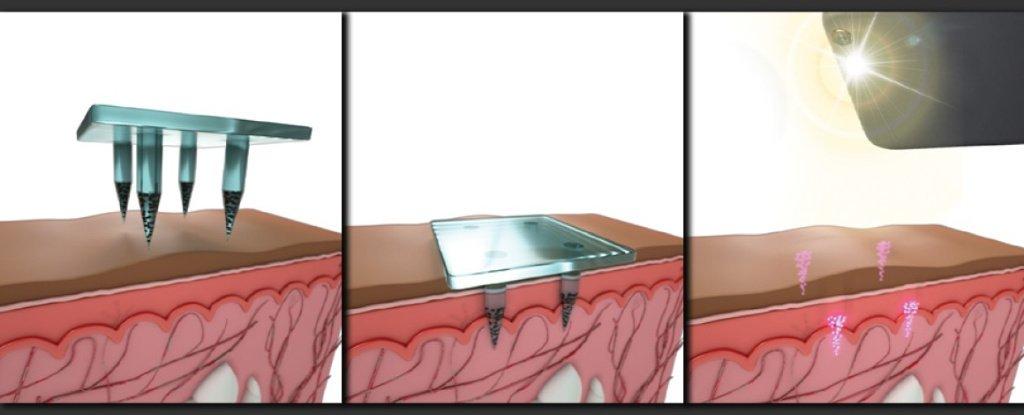 Le « tatouage » invisible accompagnant le vaccin est un motif constitué de minuscules points quantiques - de minuscules cristaux semi-conducteurs réfléchissant la lumière - qui brillent sous lumière infrarouge. Le motif - et le vaccin - se voit appliqué à la peau en utilisant des micro-aiguilles solubles de haute technologie, fabriquées à partir d'un mélange de polymères et de sucre.