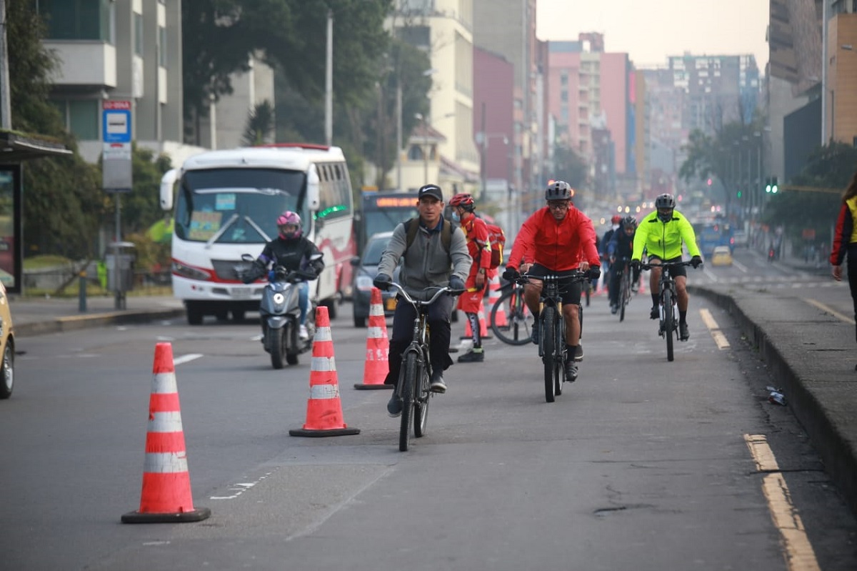 À Bogota (Colombie), les services techniques ont mis en place près de 80 kilomètres de pistes cyclables temporaires, en fermant des couloirs de bus et en réquisitionnant des voies habituellement réservées aux voitures. Ils utilisent des simples plots et de la peinture. Photo publiée sur Twitter par Nicolás Estupiñán, élu en charge de la mobilité à Bogota.