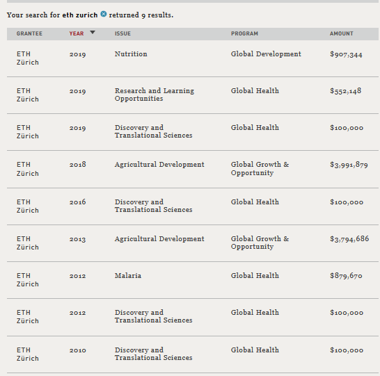 Je vous mets quelques chiffres en annexe qui feraient tourner la tête de n'importe quel directeur de centre de recherche. A relever toutefois que bien d'autres universités sont généreusement subventionnées par le couple Gates.