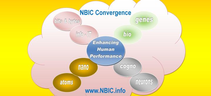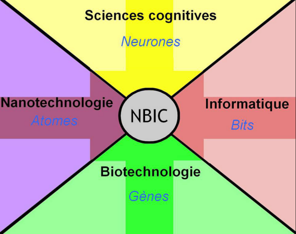 • des sciences cognitives liées au cerveau et ses cellules que sont les neurones • la biotechnologie centrée sur les gênes et bien évidemment ce qui va avec : l'appareil germinal (sperme, ovule), les chromosomes et le fœtus. • de l'informatique (Bits) qui appliquée au champ de la biologie devient la bio-informatique • La nanotechnologie (Atomes) qui est une science qui relève de l'électronique ou de la chimie ramenée à l'infiniment petit, soit de l'ordre de l'atome. Selon des spécialistes, la nanotechnologie serait elle-même dépassée et nous devrions parler de « technologie quantique »...