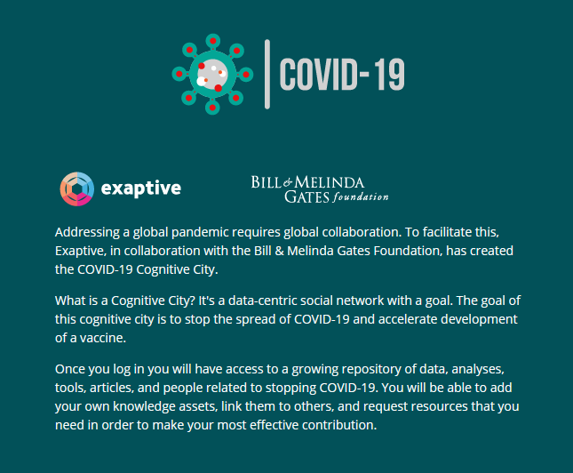 OKLAHOMA CITY, 19 mars 2020 / PRNewswire / - Exaptive, Inc., en collaboration avec la Fondation Bill & Melinda Gates, a créé un environnement en ligne gratuit et accessible au public appelé une « ville cognitive » qui se concentre sur la lutte contre le balayage pandémique le globe - COVID-19. La COVID-19 Cognitive City est un lieu unique pour cataloguer les ensembles de données, les analyses, les outils, les articles et les questions de recherche générés par la communauté mondiale sur cette maladie. Tout comme il a été démontré que les villes physiques produisent des innovations de manière répétée à travers les diverses interactions de réseau de leurs constituants, une ville cognitive utilise les données et l'analyse de réseau pour stimuler de nouvelles collaborations de recherche entre les chercheurs, les scientifiques des données, les décideurs et le citoyen concerné.