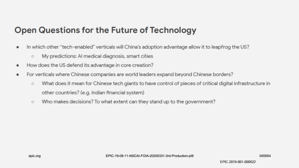 Le récent document de la NSCAI fut publié en mai 2019 et intitulé « Chinese Tech Landscape Overview » [vue d'ensemble du paysage technologique chinois]. Tout au long de la présentation, la NSCAI promeut une refonte de l'économie et du mode de vie des États-Unis comme étant nécessaire pour permettre de s'assurer qu'ils détiennent un avantage technologique considérable sur la Chine, car la perte de cet avantage est actuellement considérée comme un problème majeur de « sécurité nationale » par l'appareil de sécurité nationale américain. Cette préoccupation concernant le maintien d'un avantage technologique se retrouve dans plusieurs autres documents militaires et rapports de groupes de réflexion américains qui avertissent que l'avantage technologique des États-Unis s'effrite rapidement.