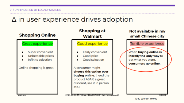 En outre, le document de la NSCAI de mai dernier appelle à la fin des achats en boutique et encourage l'évolution vers un système où tous les achats sont effectués en ligne. Il affirme que « les entreprises américaines ont beaucoup à gagner en adoptant les idées des entreprises chinoises » en se tournant vers des options d'achat exclusivement en ligne. Il affirme que seul le shopping en ligne offre une « expérience formidable » et ajoute également que « lorsque l'achat en ligne est littéralement le seul moyen d'obtenir ce que vous voulez, alors les consommateurs achètent en ligne ».