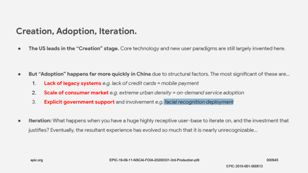 Dans sa présentation de mai 2019 intitulée « Chinese Tech Landscape Overview », la NSCAI explique que si les États-Unis sont toujours en tête au stade de la « création » d'IA et des technologies connexes, ils sont en retard sur la Chine au stade de l'« adoption » en raison de « facteurs structurels ». Elle affirme que la « création », suivie de l'« adoption » et de l'« itération » sont les trois phases du « cycle de vie des nouvelles technologies » et affirme que si la phase d'« adoption » n'est pas rapidement dominée, la Chine pourra « dépasser » les États-Unis et dominer l'IA dans un avenir prévisible.